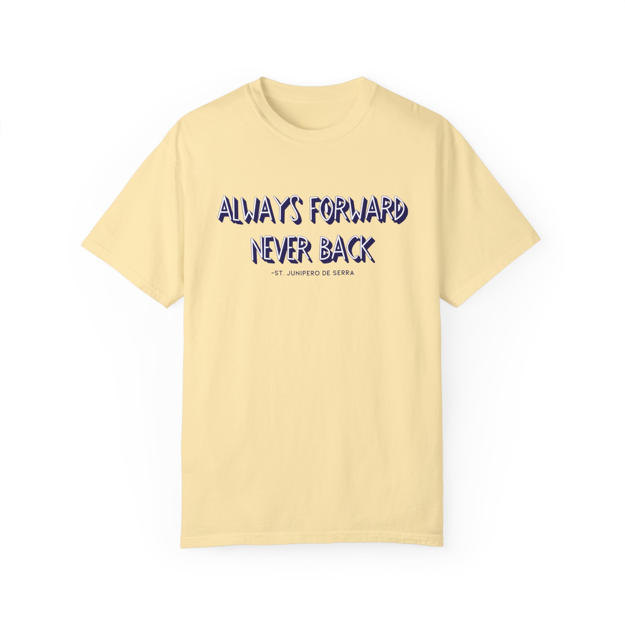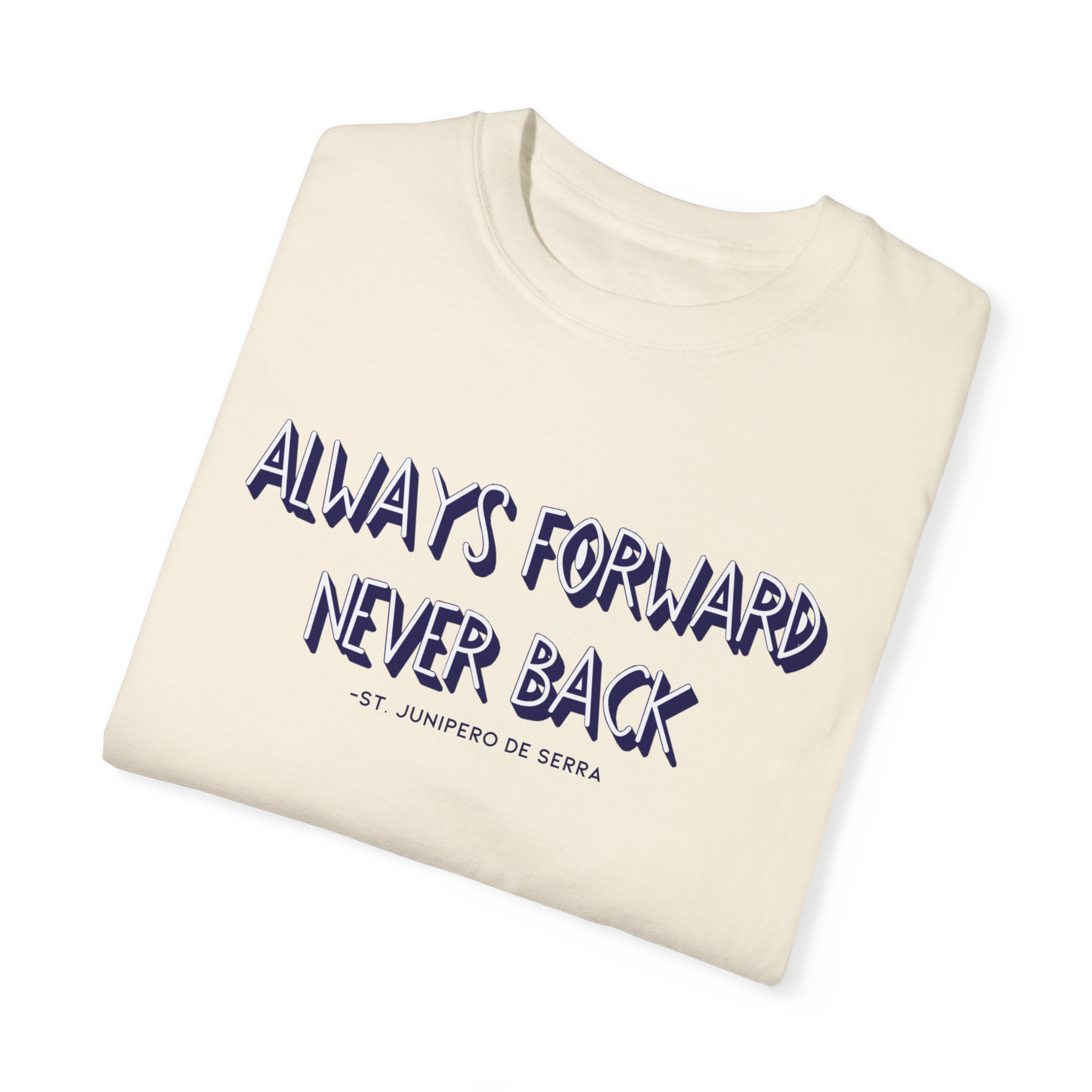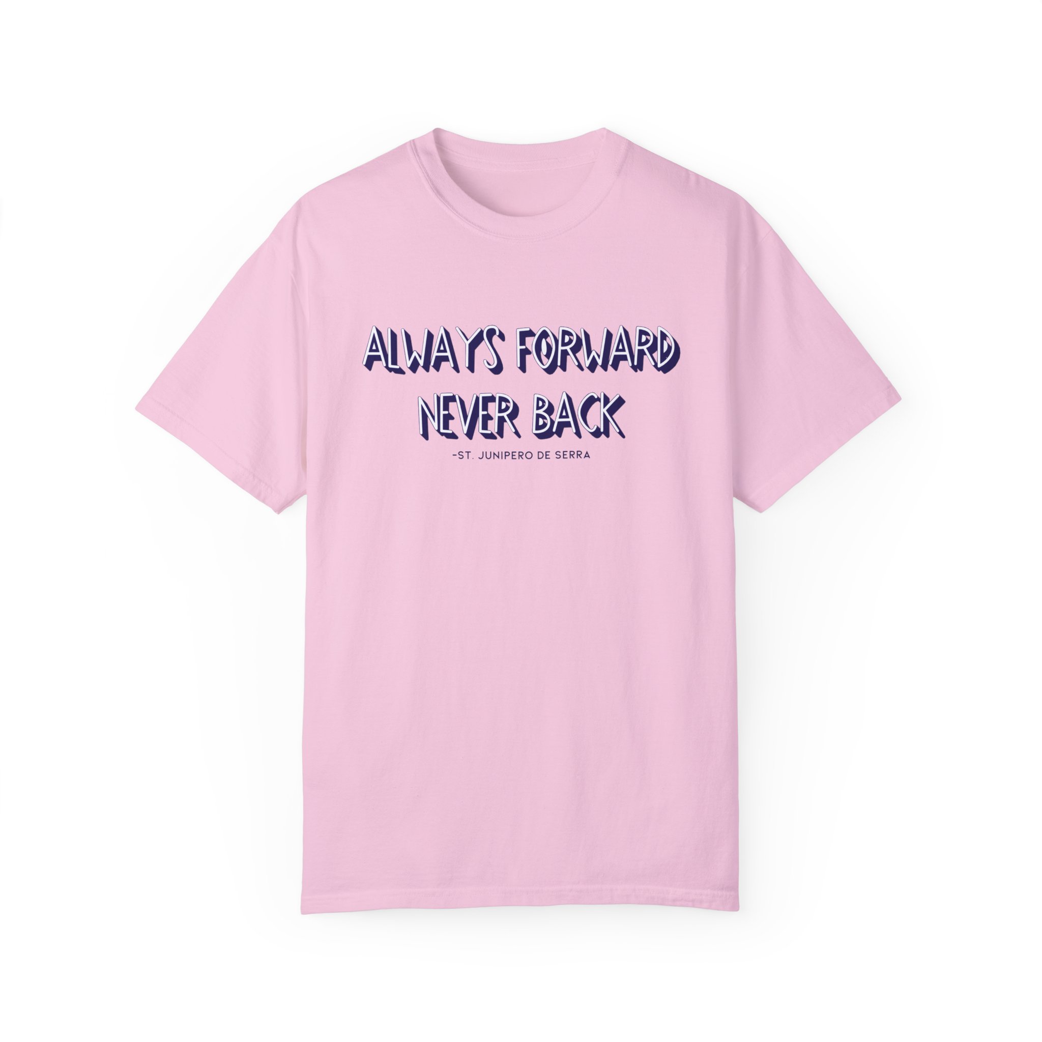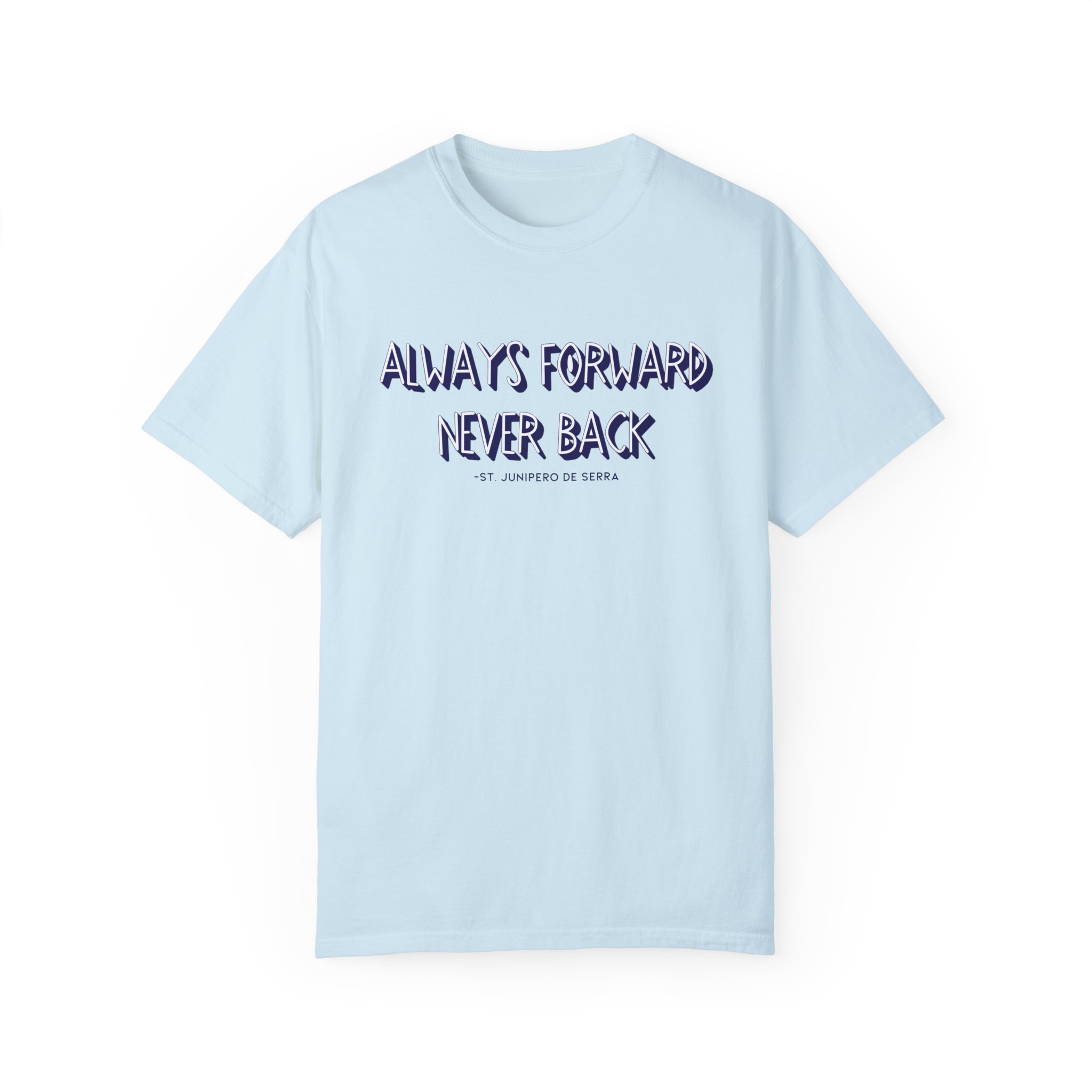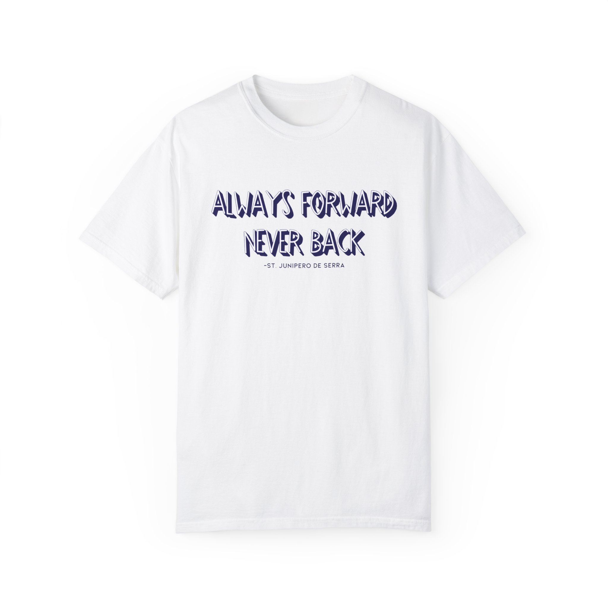 The “Always forward, Never back” design is inspired by a quote from St. Junípero Serra. What he meant by this phrase is that we should focus on moving forward with hope, rather than dwelling on the past. This shirt is not only motivational but also incredibly comfortable, crafted from itch-free, high-quality fabric. It’s the perfect choice for a variety of situations.