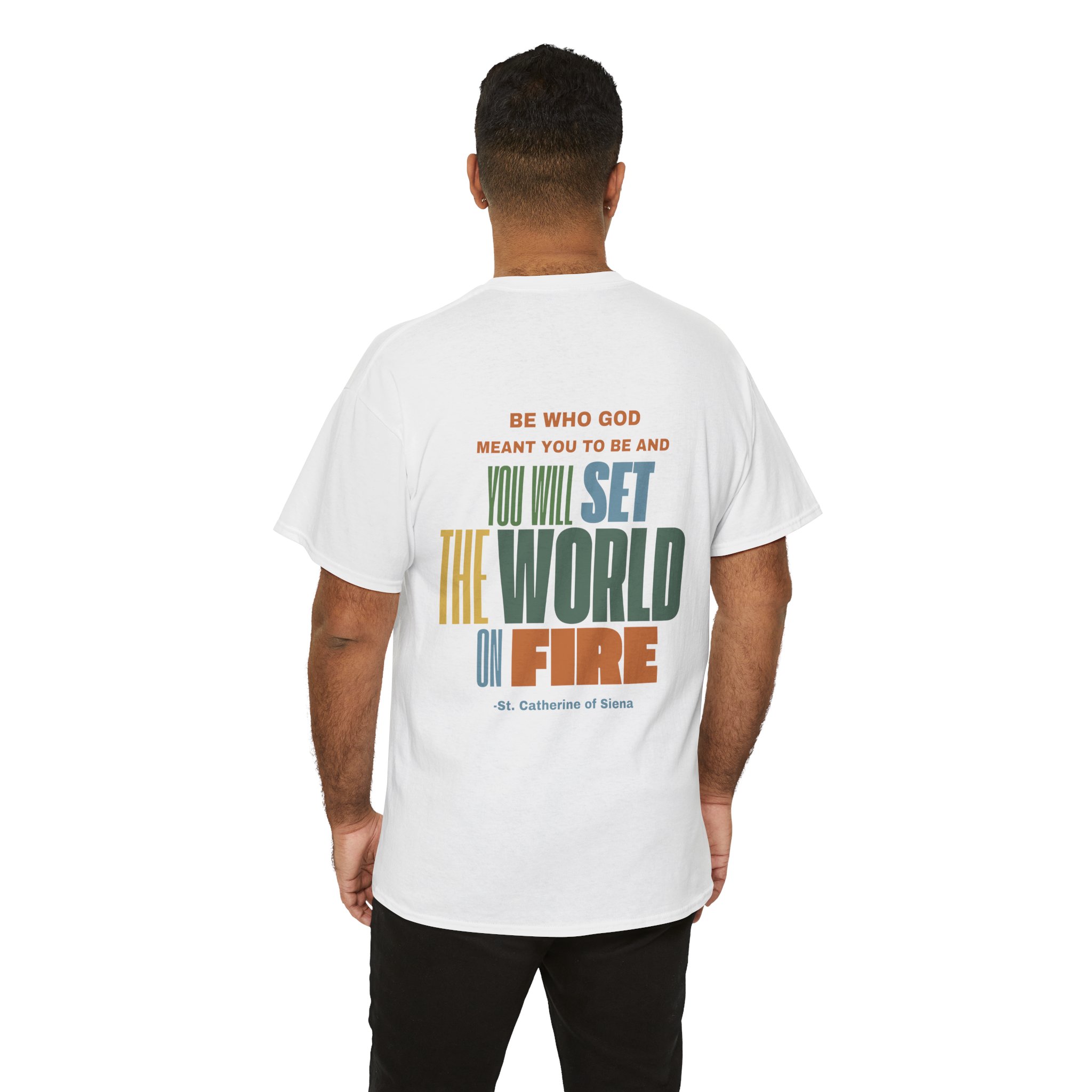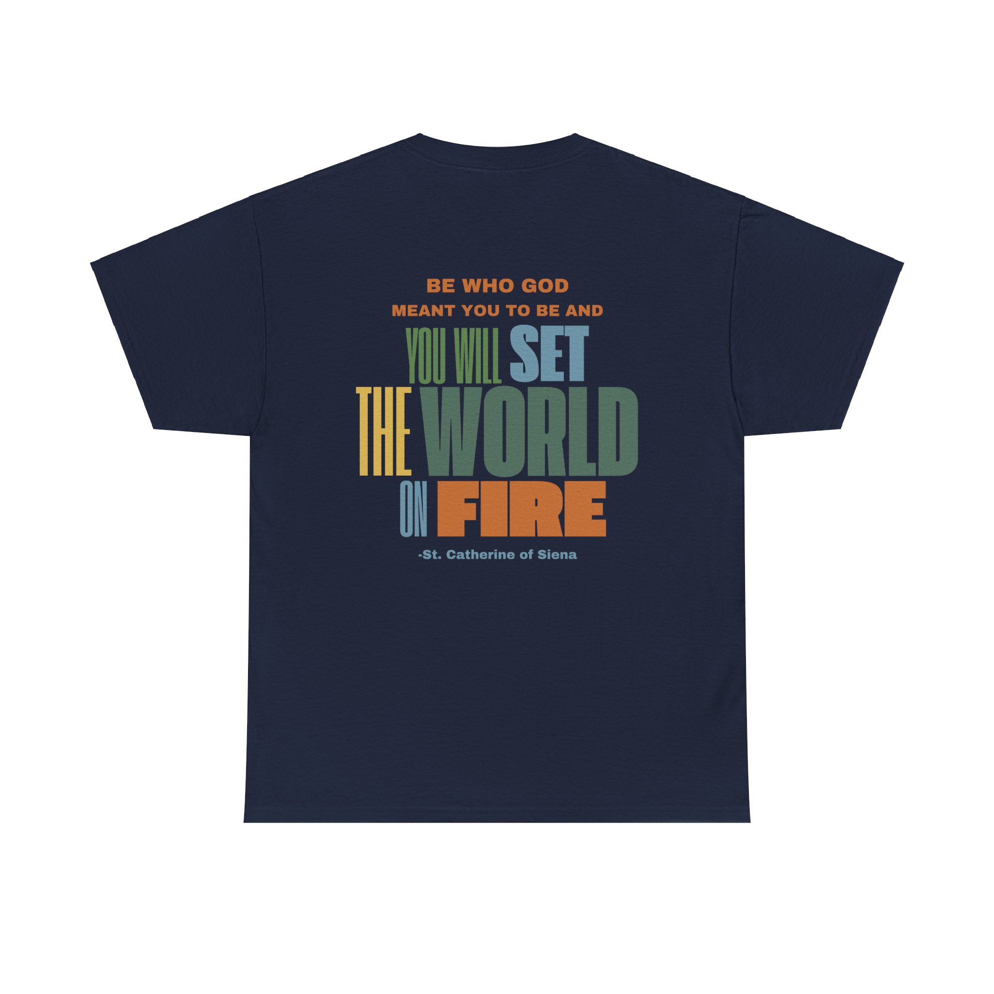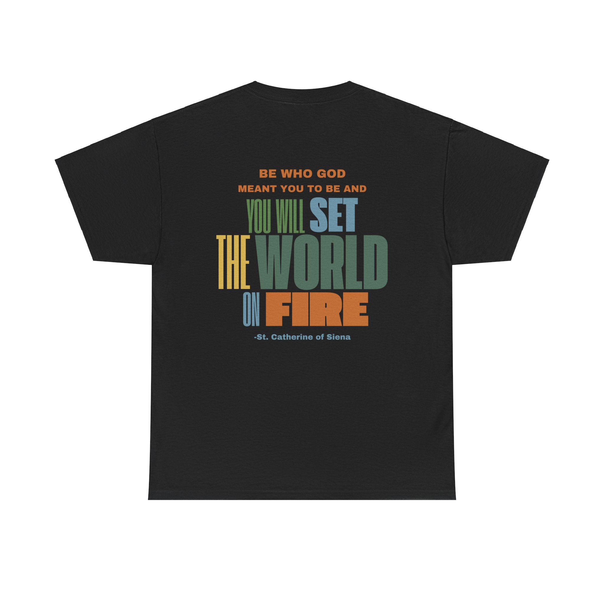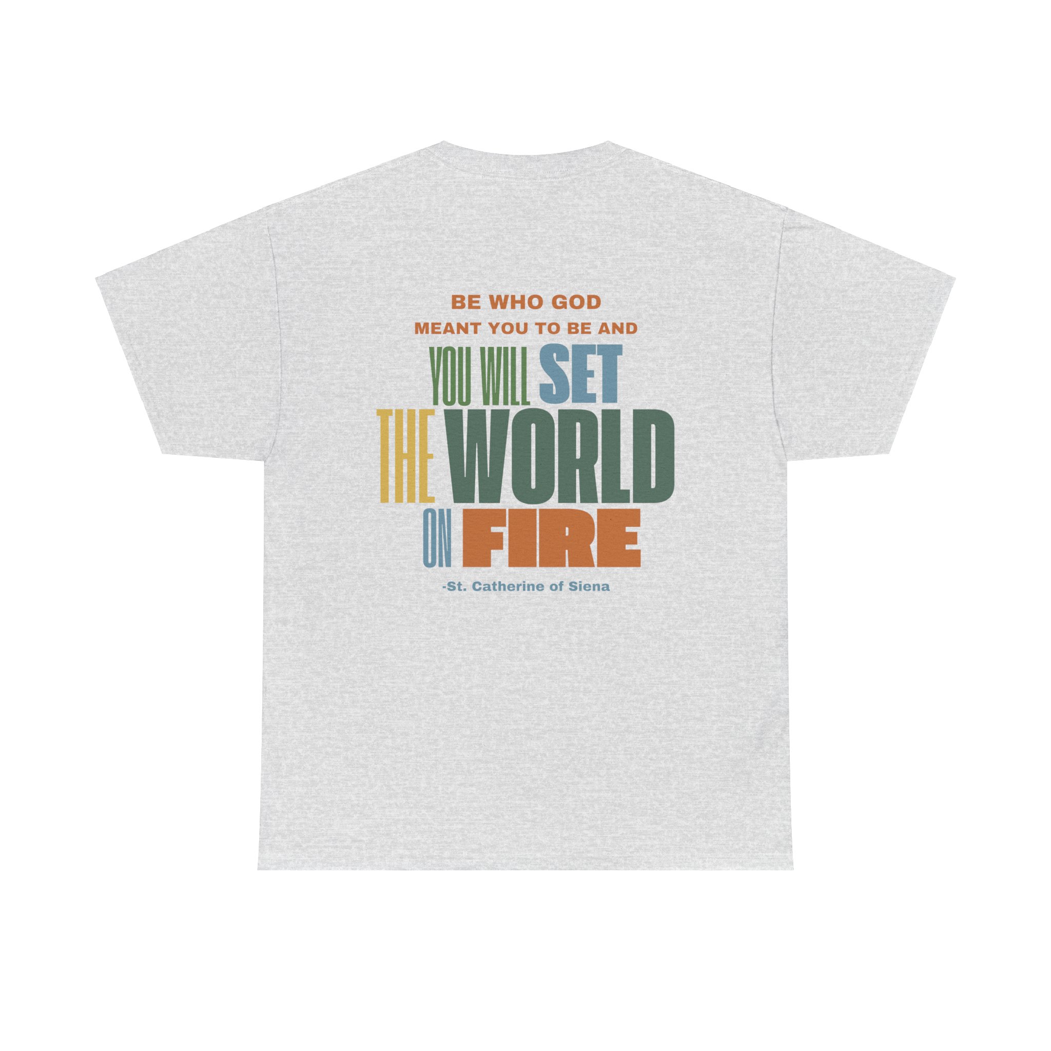 This t-shirt features the powerful quote “Be who God meant you to be and you will set the world on fire” by St. Catherine of Siena, presented in bold, eye-catching lettering that emphasizes the strength of the message. The design is a visual representation of God’s power, encouraging wearers to embrace their divine purpose and realize their true potential. Made from ultra-soft, breathable fabric, it offers all-day comfort with no irritation—perfect for everything from casual outings to peaceful moments at home. The combination of its spiritual message and stylish design makes this tee a meaningful addition to any wardrobe. It’s a reminder that by embracing God’s plan for us, we can tap into a limitless power that can transform both our lives and the world around us.