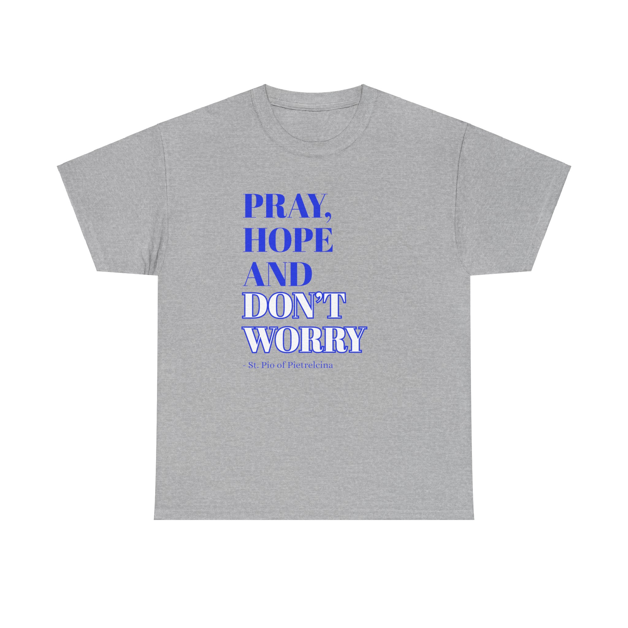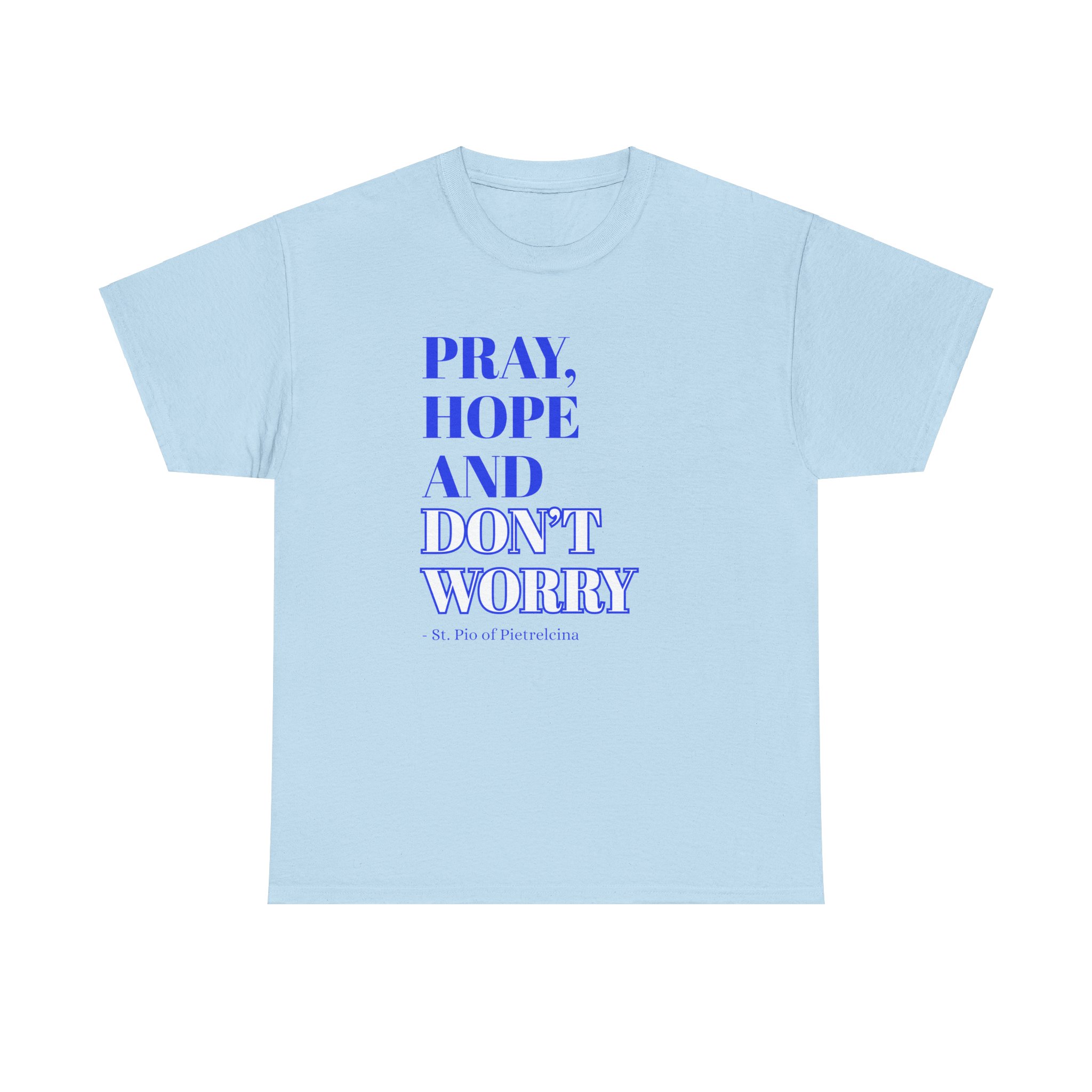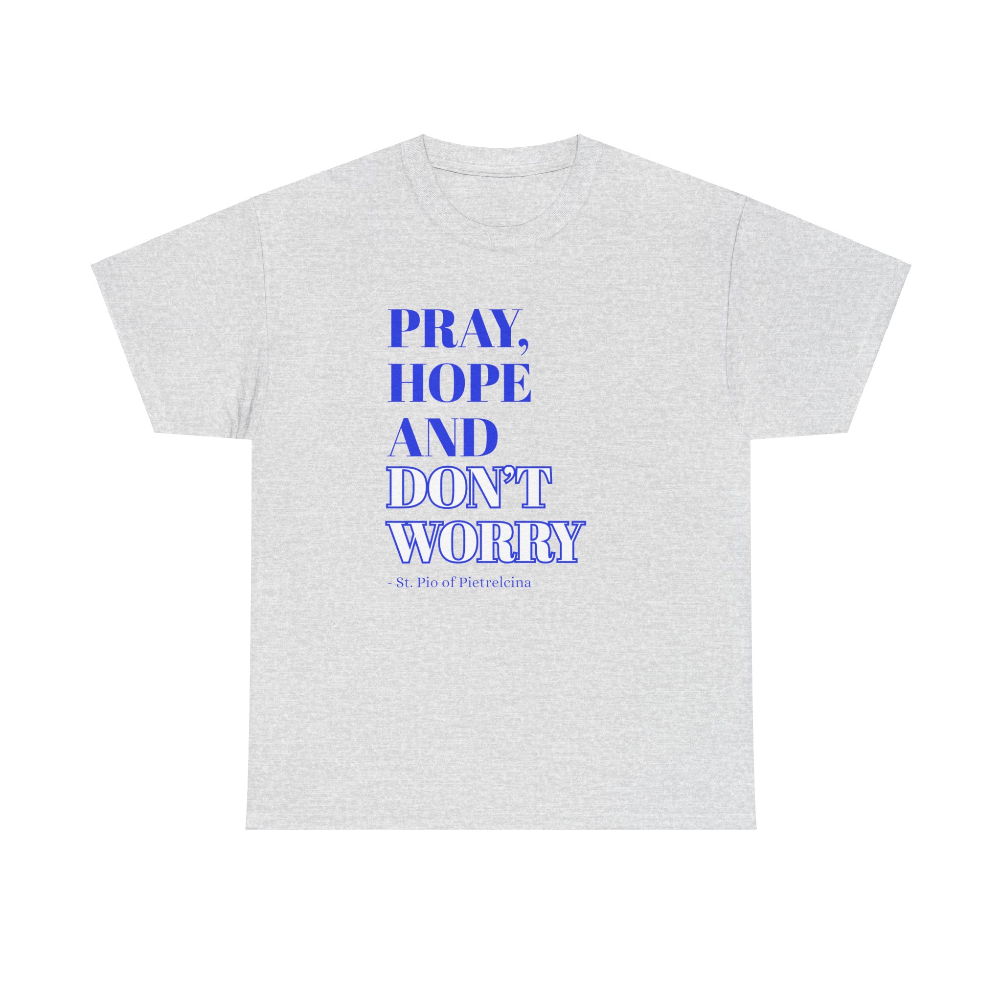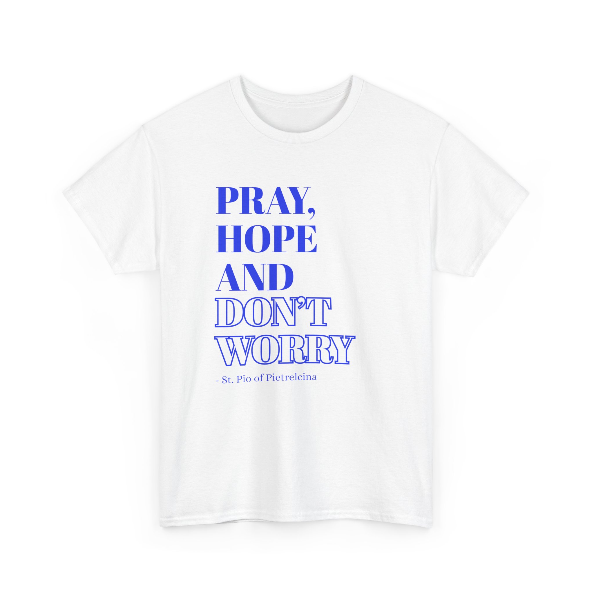 This T-shirt features a beautifully printed quote from St. Pio: “Pray, Hope, and Don’t Worry,” offering a reminder to trust in God’s plan and find peace in faith. The encouraging words are a perfect way to stay grounded and inspired throughout your day. Made from soft, breathable cotton, it offers a relaxed fit that ensures all-day comfort. The fabric is lightweight yet durable, making it perfect for casual wear or layering. The design showcases a simple, elegant font that stands out without being overpowering, making it a great choice for everyday wear or as a thoughtful gift. Available in a variety of colors, the shirt allows you to express your personal style while spreading an uplifting message. Whether you’re lounging at home or out with friends, this T-shirt will inspire faith, encourage peace, and provide comfort wherever you go.