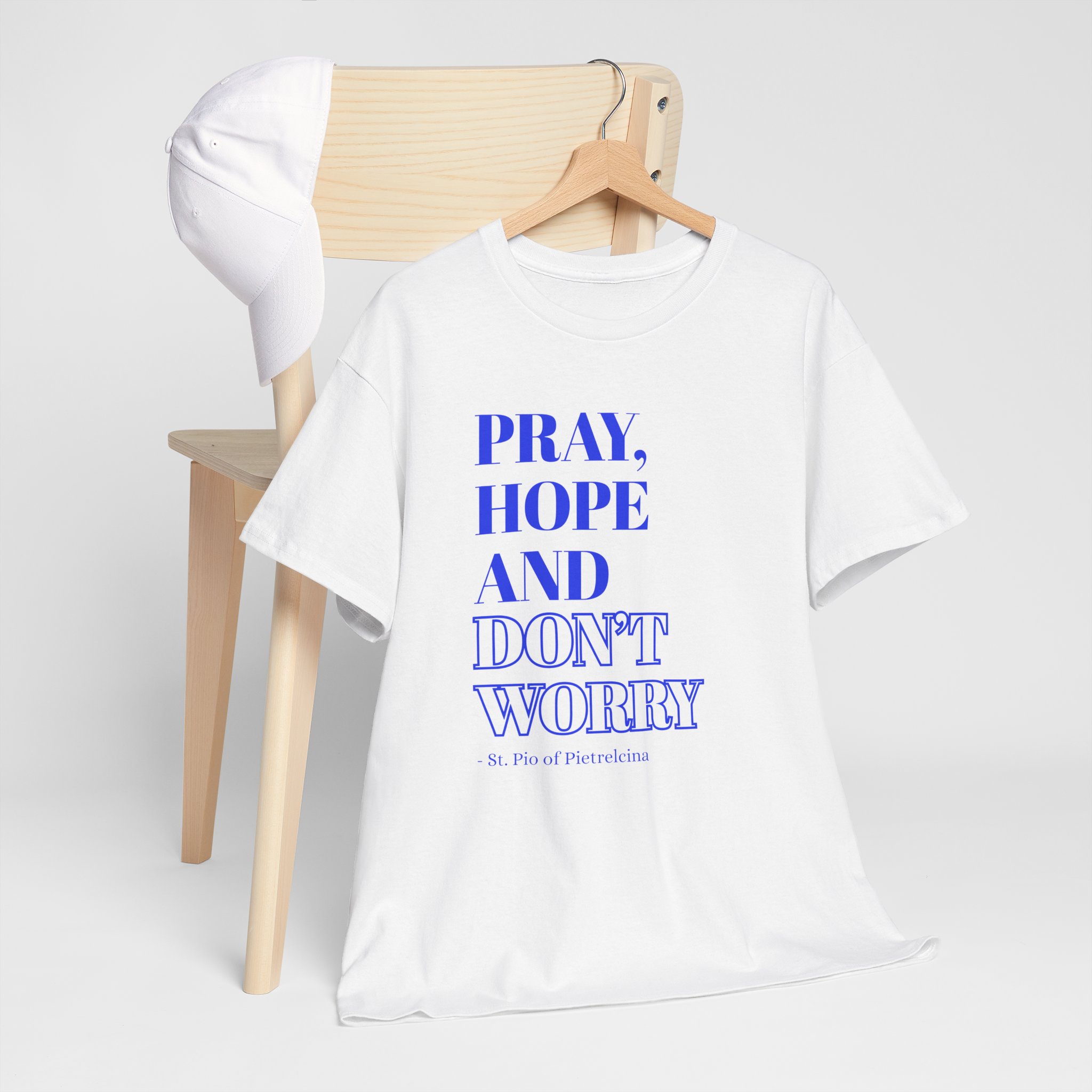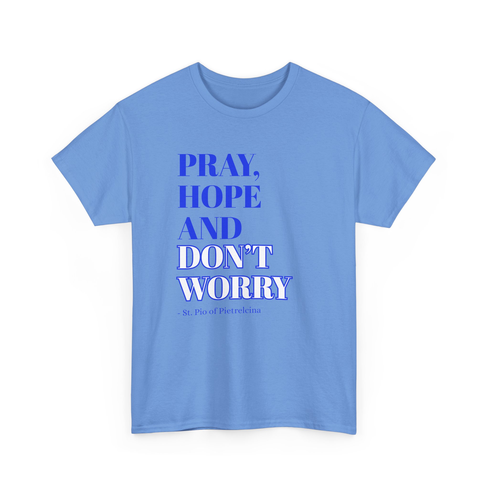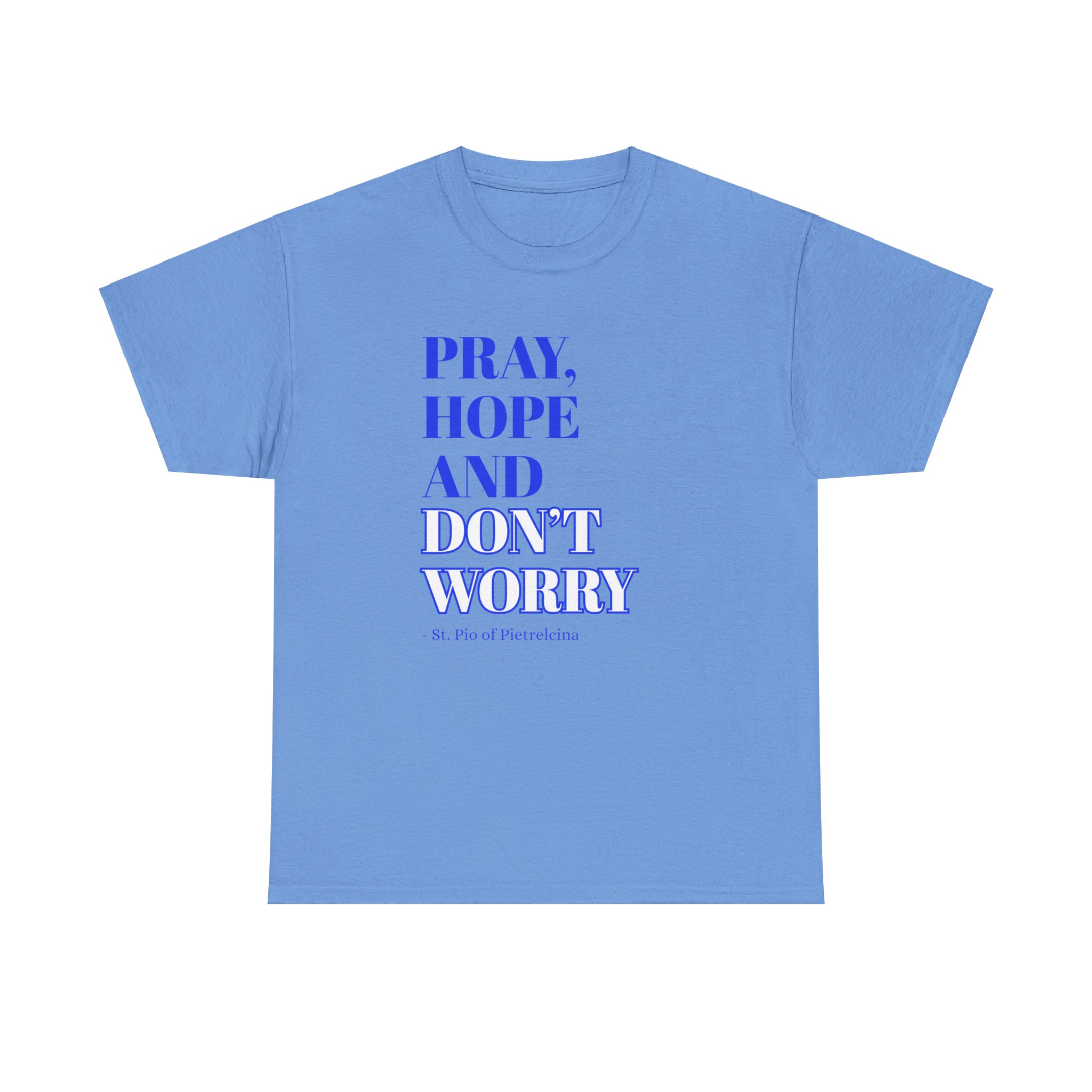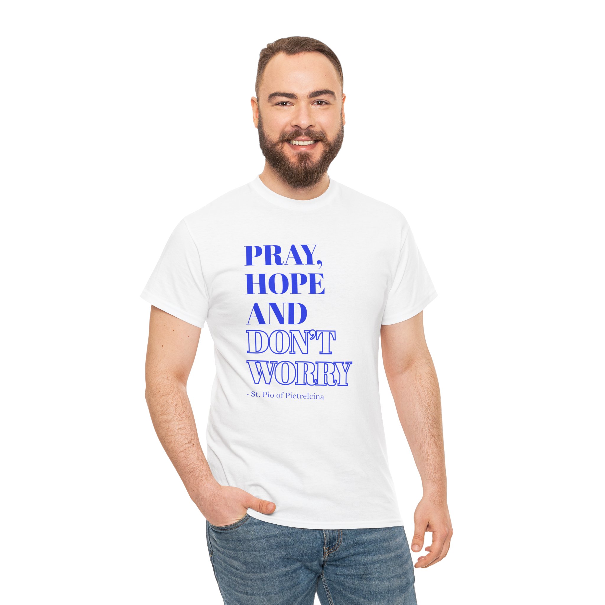 This T-shirt features a beautifully printed quote from St. Pio: “Pray, Hope, and Don’t Worry,” offering a reminder to trust in God’s plan and find peace in faith. The encouraging words are a perfect way to stay grounded and inspired throughout your day. Made from soft, breathable cotton, it offers a relaxed fit that ensures all-day comfort. The fabric is lightweight yet durable, making it perfect for casual wear or layering. The design showcases a simple, elegant font that stands out without being overpowering, making it a great choice for everyday wear or as a thoughtful gift. Available in a variety of colors, the shirt allows you to express your personal style while spreading an uplifting message. Whether you’re lounging at home or out with friends, this T-shirt will inspire faith, encourage peace, and provide comfort wherever you go.